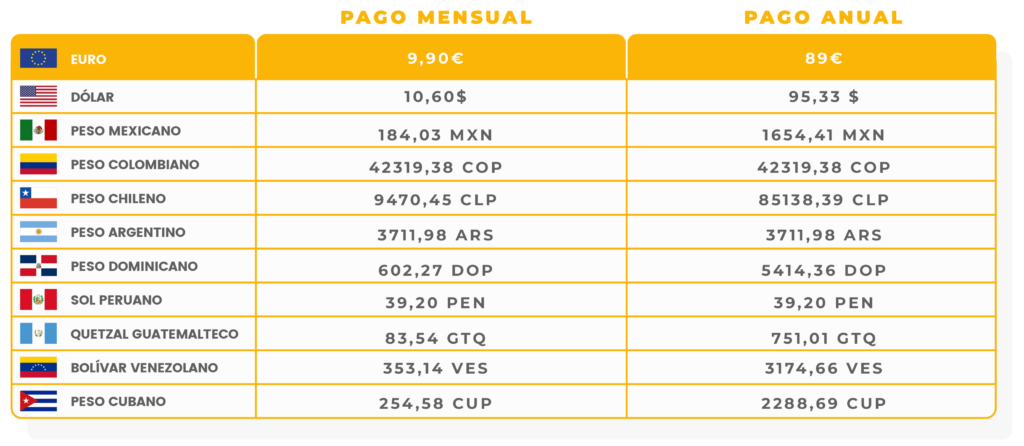 Si quieres saber el precio del plan con otra moneda, haz click aquí